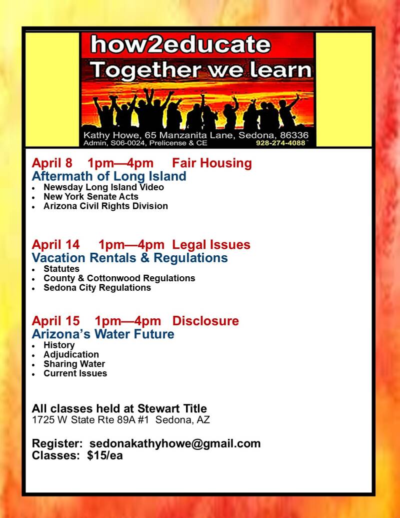 Learn from Kathy Howe, Owner/Administrator/Educator, who brings extensive experience teaching Graduate Real Estate courses for the Arizona and Hawaii Associations of REALTORS, real estate law at Yavapai College, and writing for Kaplan/Dearborn Publishing. Benefit from her expertise and commitment to your success.